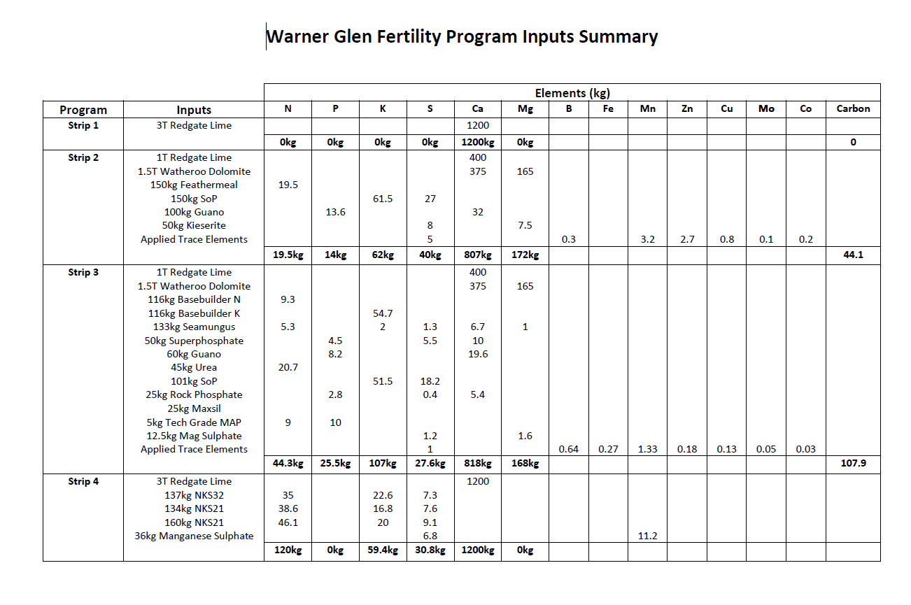 - Program 1 was based on DPIRD fertiliser calculations and agronomist recommendations. It involved pH adjustment and seasonal NPK and S applications with granulated fertilisers as informed by soil and plant testing.