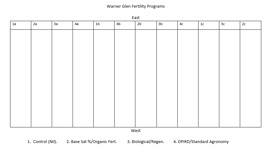 Step 1. Twelve 25m wide strips were marked out in a paddock, of which 3 random strips were allocated to each fertility program. Soil tests were carried out to inform fertiliser requirements.