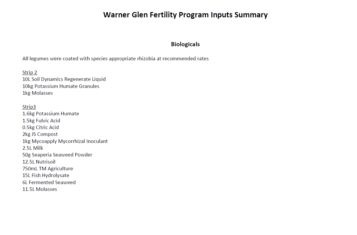 - Program 3 followed agroecological recommendations and involved a range of strategies to try and improve nutrient use efficiency including pH adjustment, biological and nutritional planting furrow treatments, combining fertilisers with carbon sources and/or bio-stimulants, and the application of foliar nutrient sprays, informed by soil and plant tests.