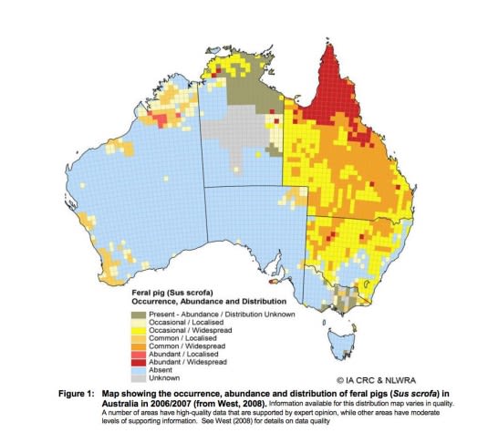 The actual population of feral pigs in Australia isn't known. Although, their distribution across Australia is growing. In 2019 the feral pig population was estimated to be 3.2 million.
