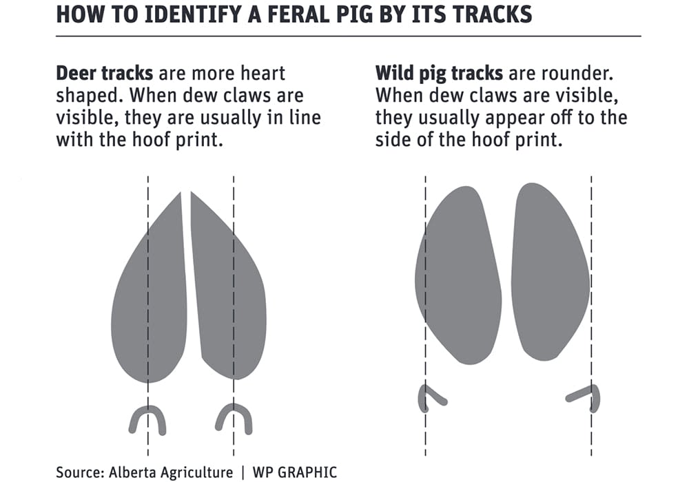 It is important to correctly identify the tracks. Pigs have four toes, but only the middle two have well-developed hooves so only those two are prominent in tracks. Their deft claws can be seen in soft ground.