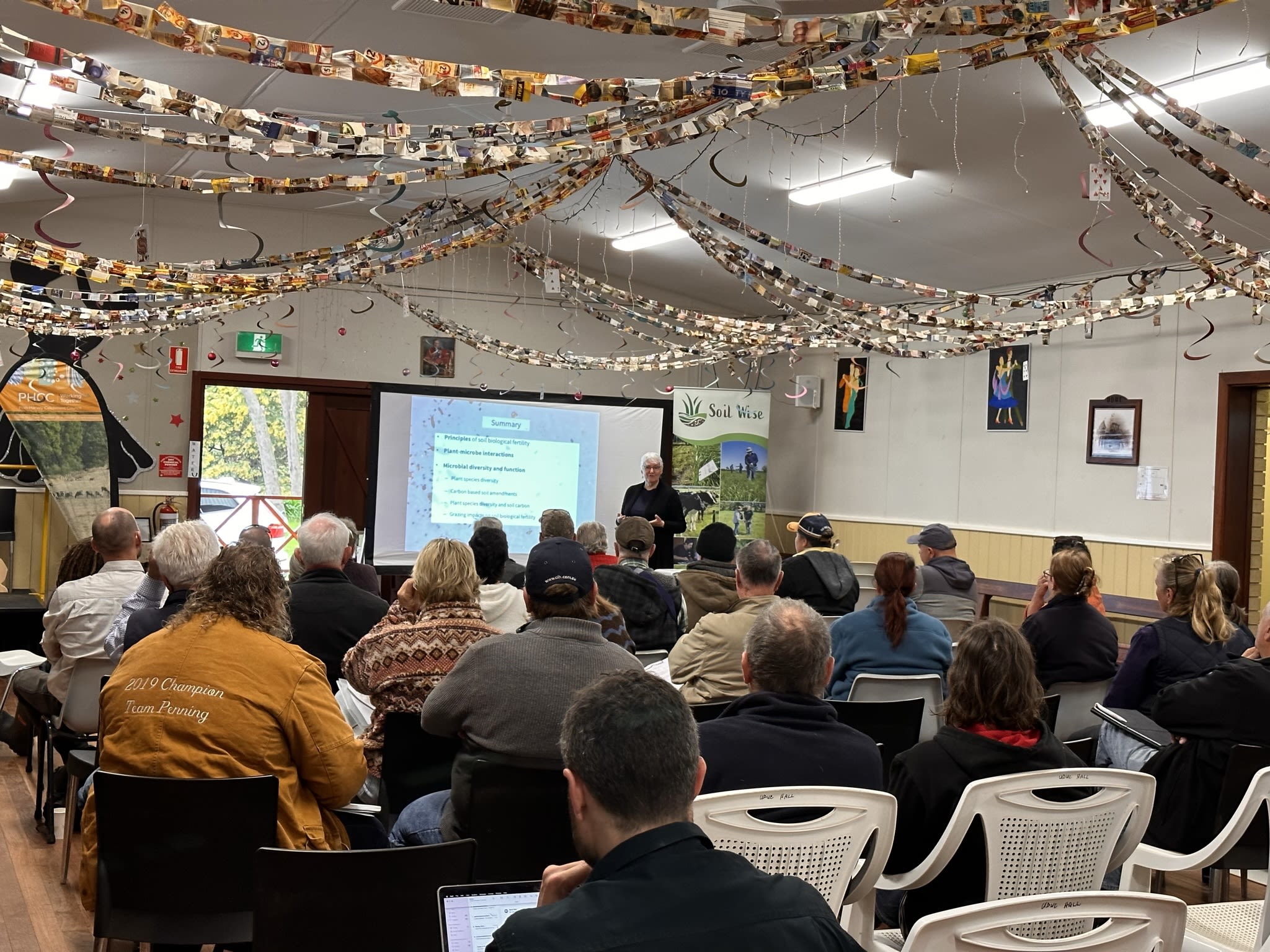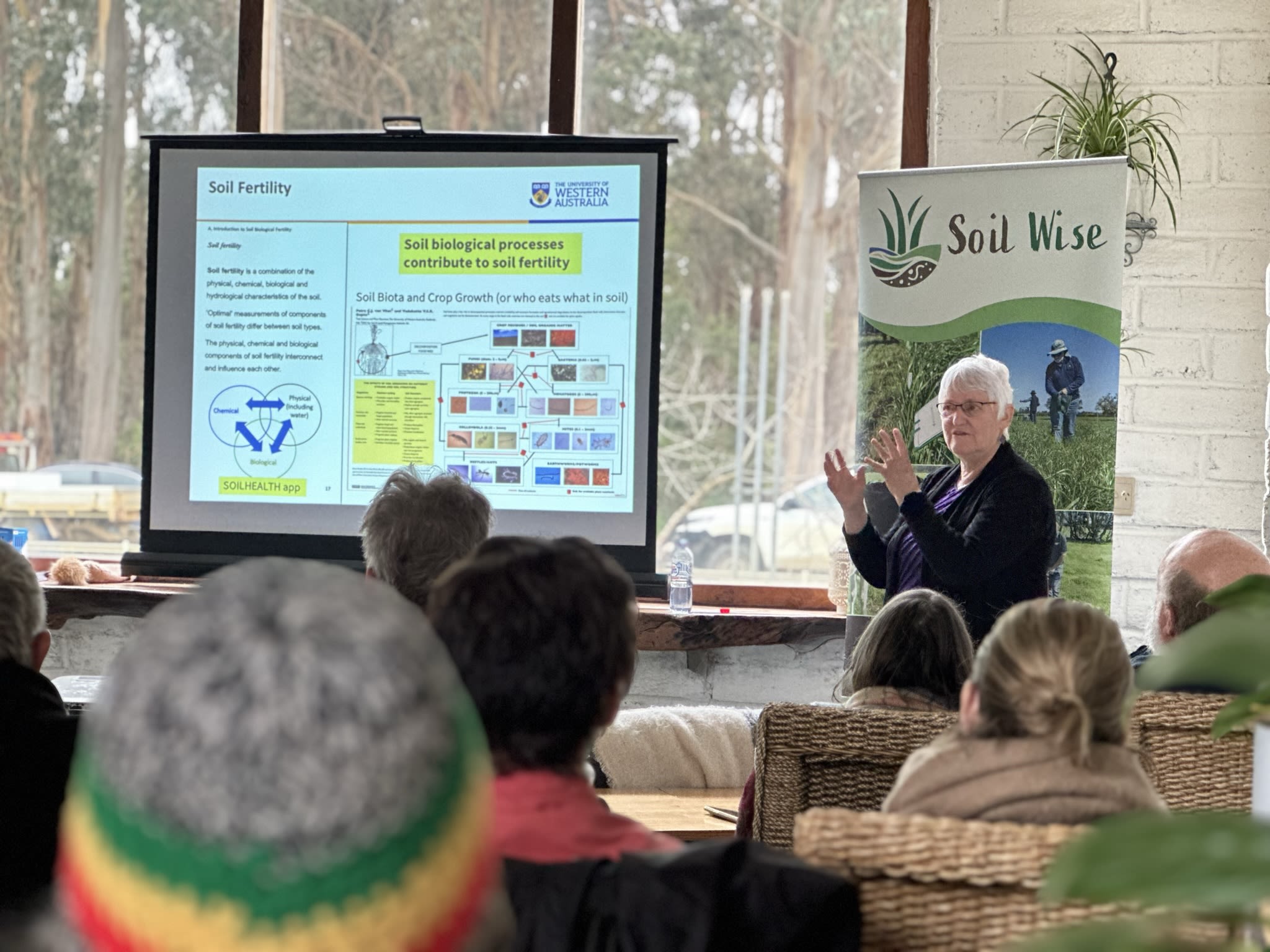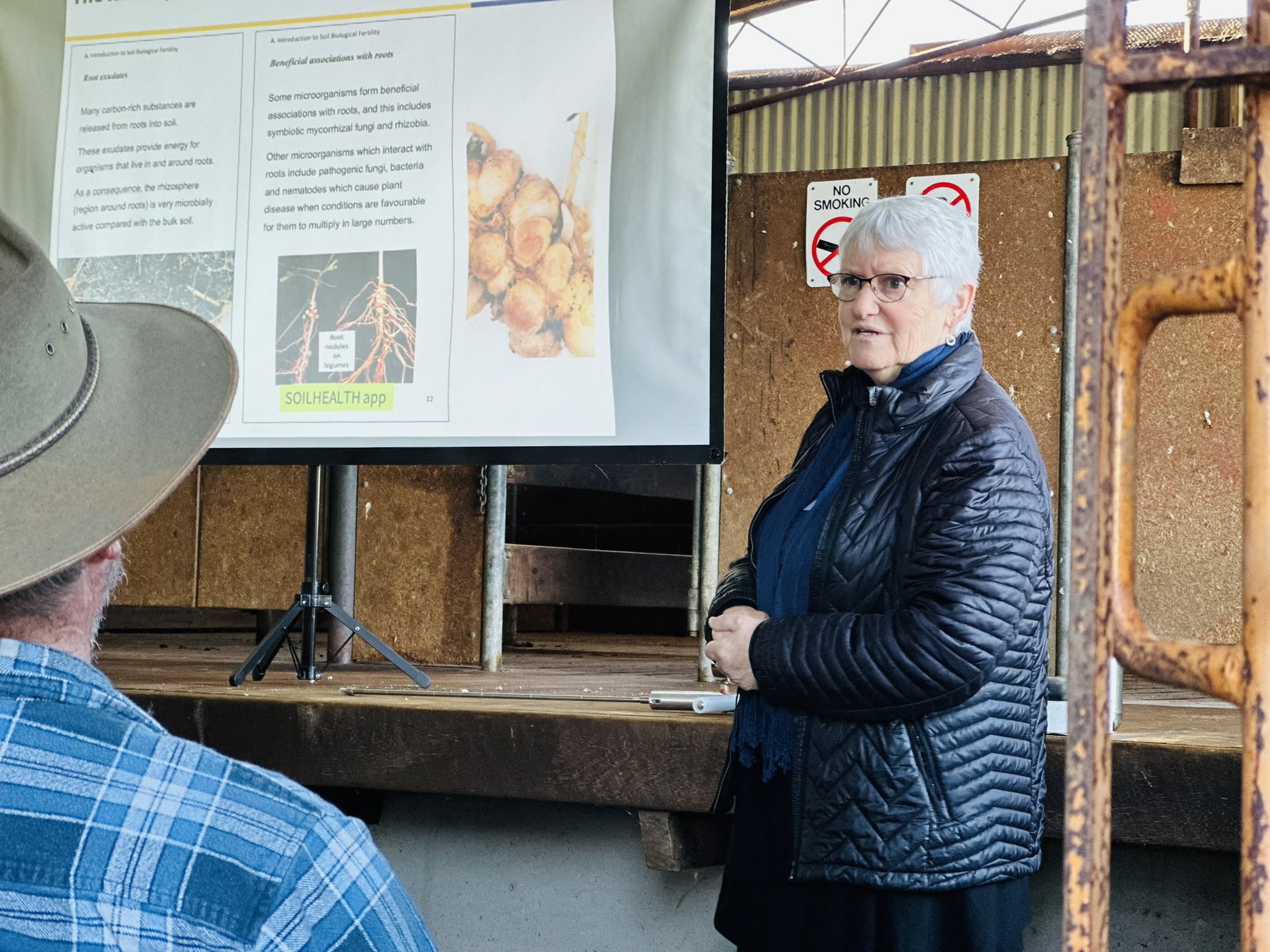 Roadshow presenters Emerita Professor Lynette Abbott, and cropper, beef farmer and multi-species seed producer Grant Sims, shared their experiences of soil health, soil biology and multi-species pastures and cropping: