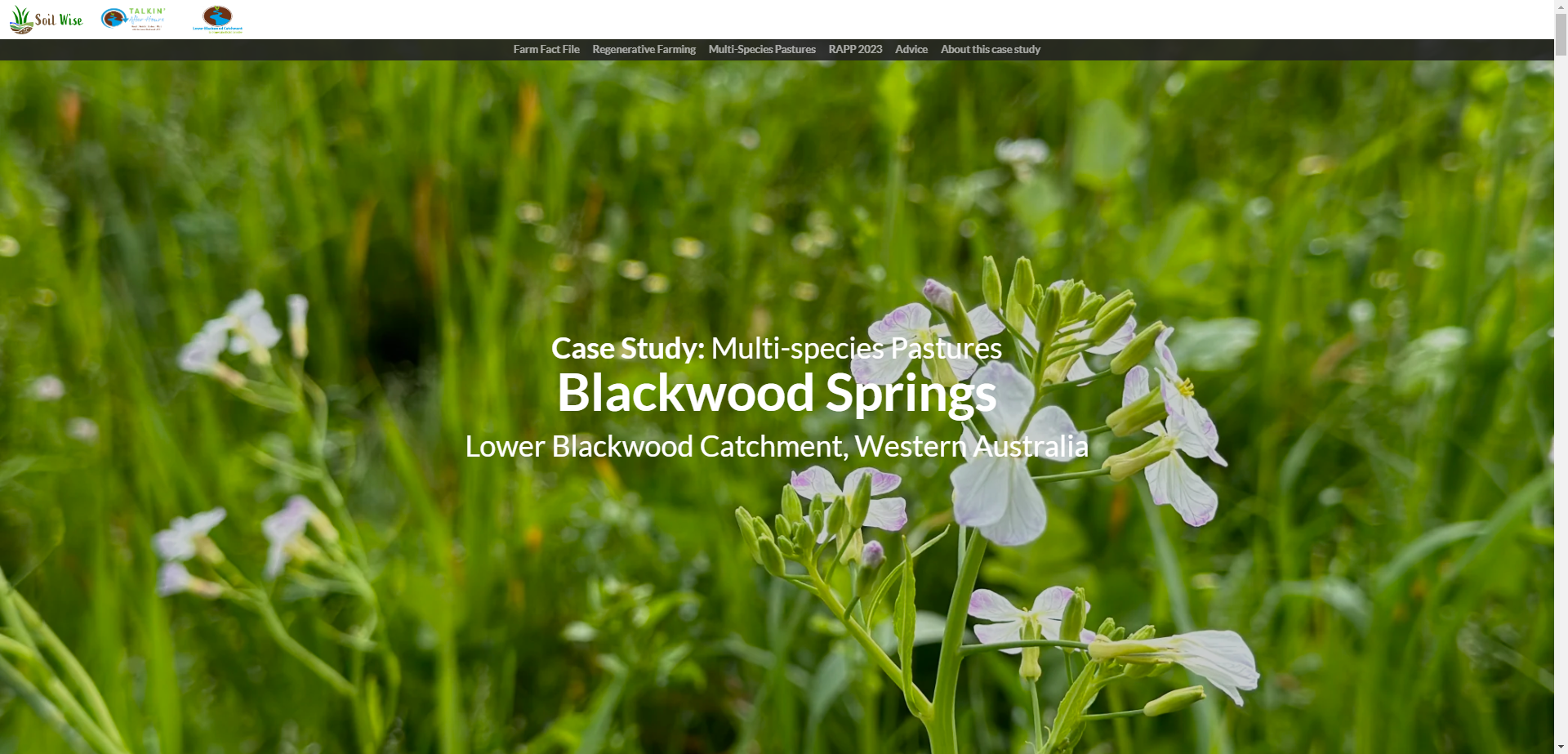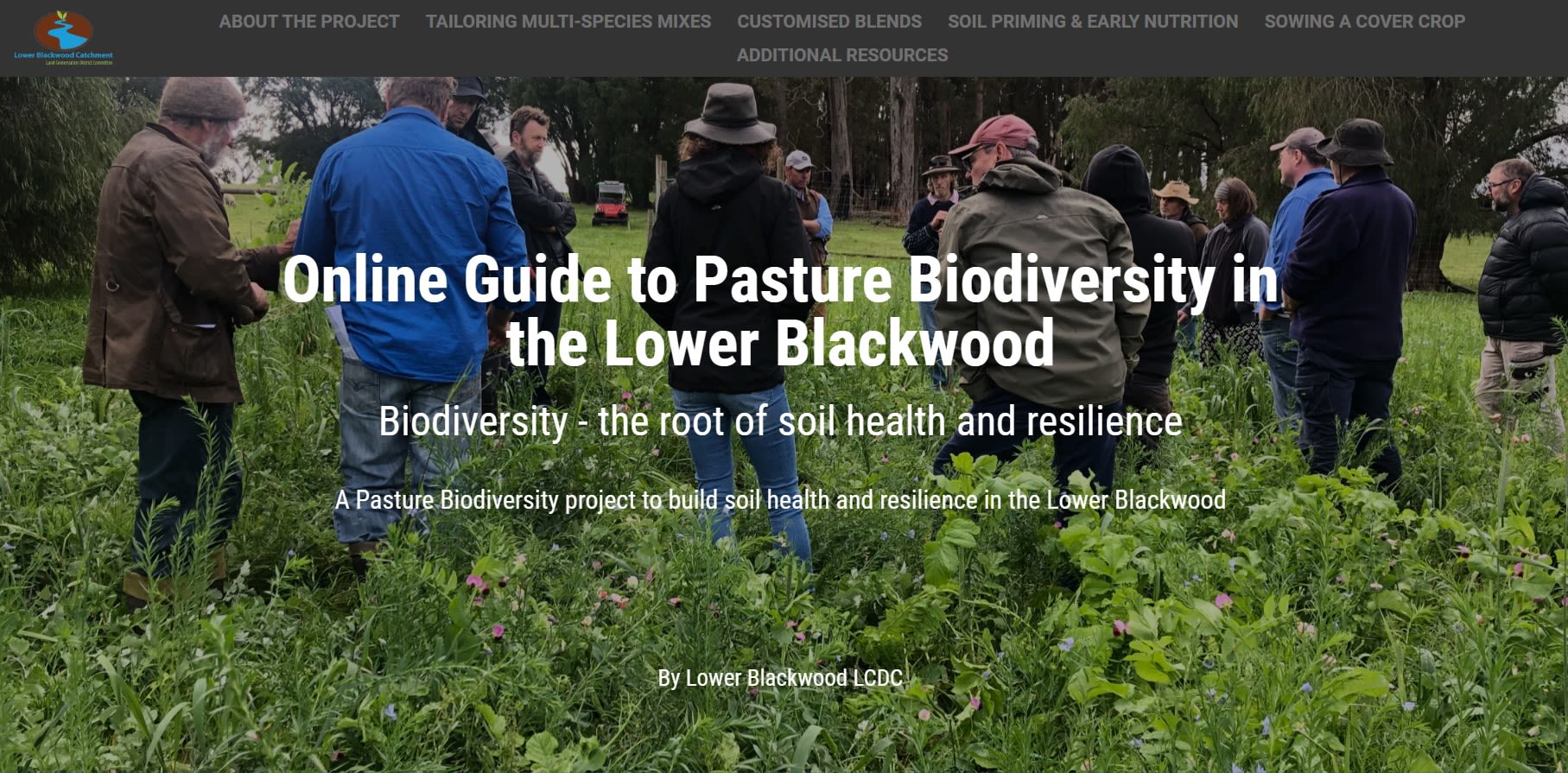 The Online Guide to Pasture Biodiversity in the Lower Blackwood was developed out of a Lower Blackwood Landcare project to demonstrate the efficacy of seeding multi-species annual and perennial plants to improve farm drought resilience. This practical, multi-media package includes species selection, seeding, establishment and ongoing management of diverse pastures in our local environment. Enter the guide by clicking on the image.