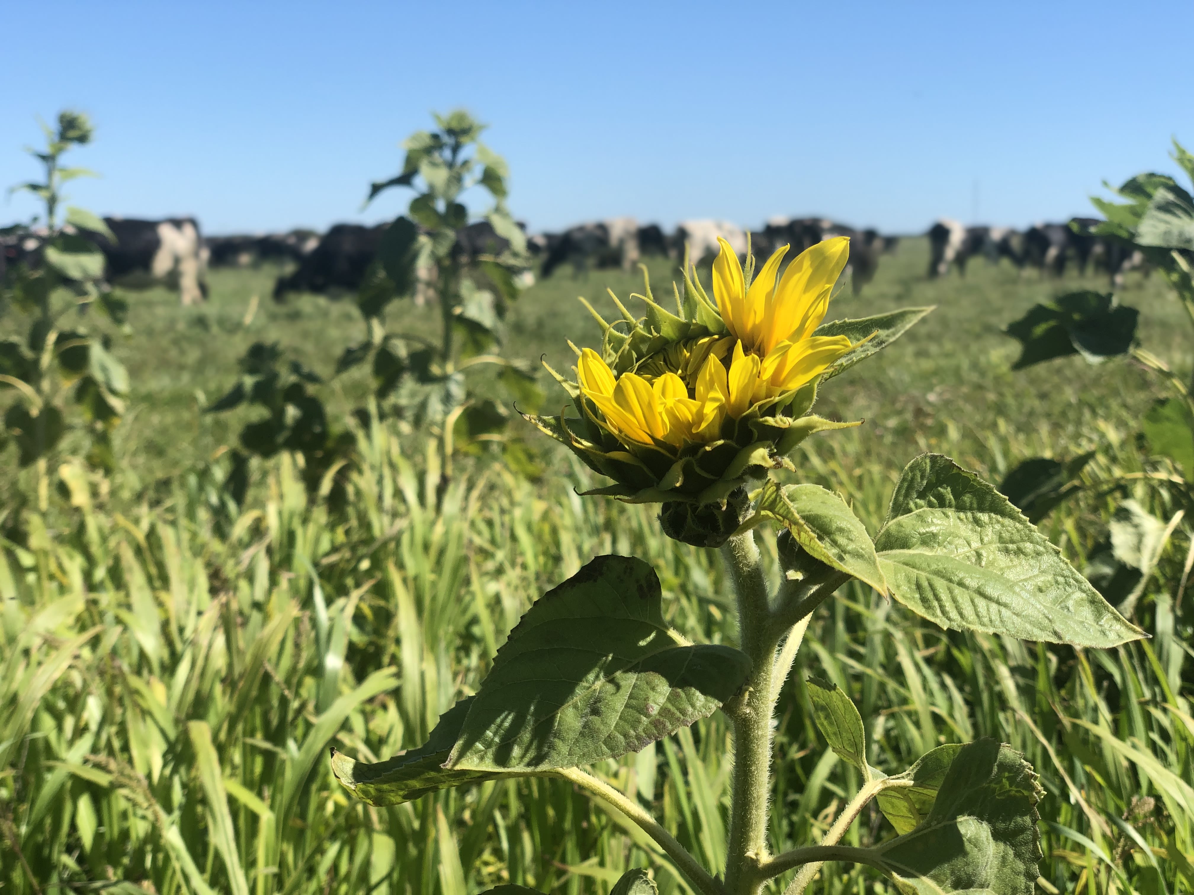 Sunflower at Boley's Farm, Scott River. The cows ignored the sunflower at the first graze, but enjoyed the seeds once the flower head finished (second grazing).