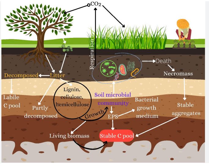 Stable carbon is dominated by 'microbial necromass' - dead products and residues. Necromass formation is driven by the rate of root exudation, the amount of microbial biomass and the rate of conversion to necromass.